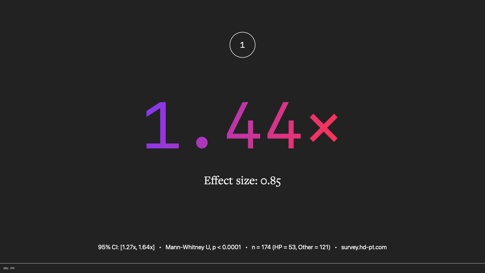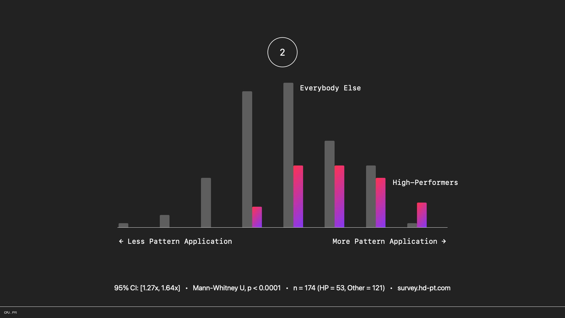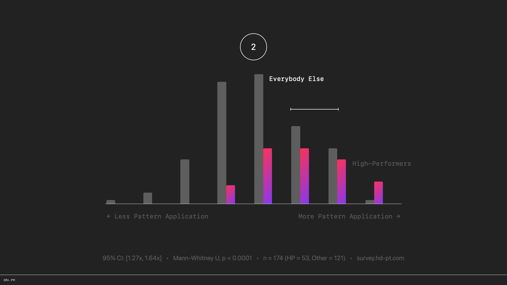 High performers adopt these patterns at 1.44 times the rate of everyone else (95% CI: 1.27x–1.64x). The overall effect size is a Cohen's d of 0.85, which means the average high-performing respondent scores higher than eighty percent of the comparison group (Mann-Whitney U, p < 0.0001). That's describing a different world!