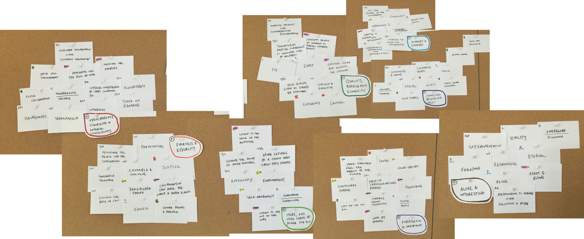A meta analysis is a handy tool here, since loads of really smart folks – sometimes individuals, sometimes groups – have given the world lists of performance criteria that can guide the conversation. I gathered a bunch of these lists, put each individual item on cards, and with the help of a few colleagues, put them into groups. I sourced 102 criteria in total, distilled from fourteen seminal references that span industrial design, urbanism, organizational science, and global governance. The list pulls equally from evergreen classics and contemporary fieldwork: Dieter Rams’ Ten Principles of Good Design; the original Agile Manifesto; Christopher Alexander’s Quality Without a Name; Salim Ismail’s growth blueprint Exponential Organizations; Jacob Morgan’s Future of Work; the worker-centric approach of Zeynep Ton’s Good Jobs Institute; Jane Jacobs’ urban vitality lessons from The Death and Life of Great American Cities; Kevin Lynch’s criteria on good city form in The Image of the City; Frederic Laloux’s teal and green development stages in Reinventing Organizations; the peer-to-peer ethos of the Responsive Org movement; the sustainability-forward leadership agenda of The B Team; UN guidelines on good governance and public administration; the high-performance team research of Wageman, Hackman & Lehman; and Yves Morieux’s Six Simple Rules. If you have some additional sources, send them my way!