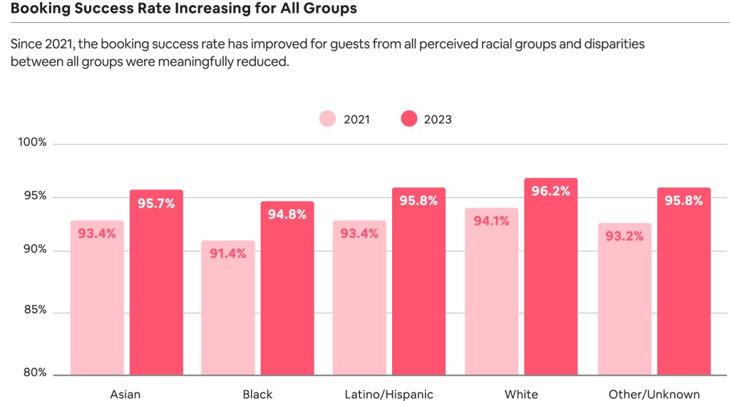This can and should extend to the product, too! Airbnb’s Project Lighthouse uses privacy-safe data to detect racial gaps in booking approvals; product tweaks since 2020 have cut the Black-vs-white booking-success gap nearly in half, with every group now above a 94 % success rate.