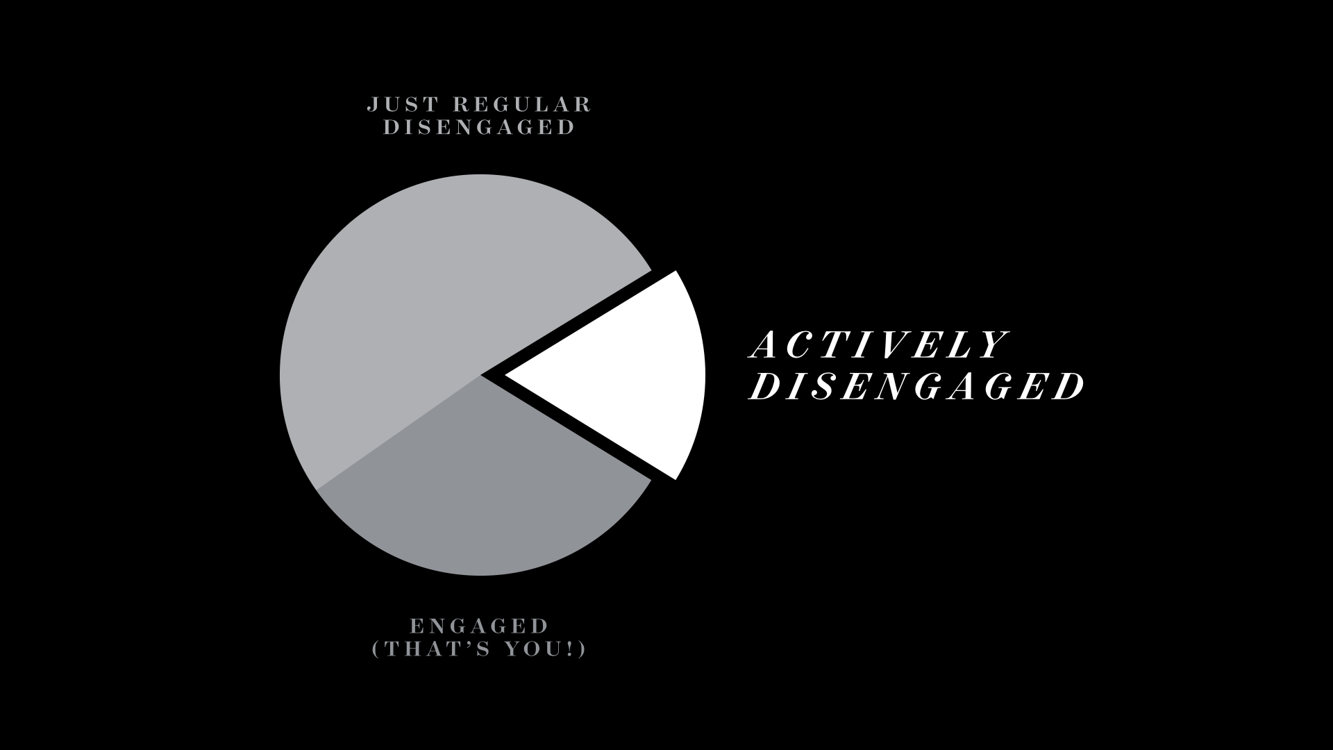 We see it when we look at engagement at work. In the United States, fully 17% of workers are actively working against their employers and colleagues, and half are just plain checked-out.