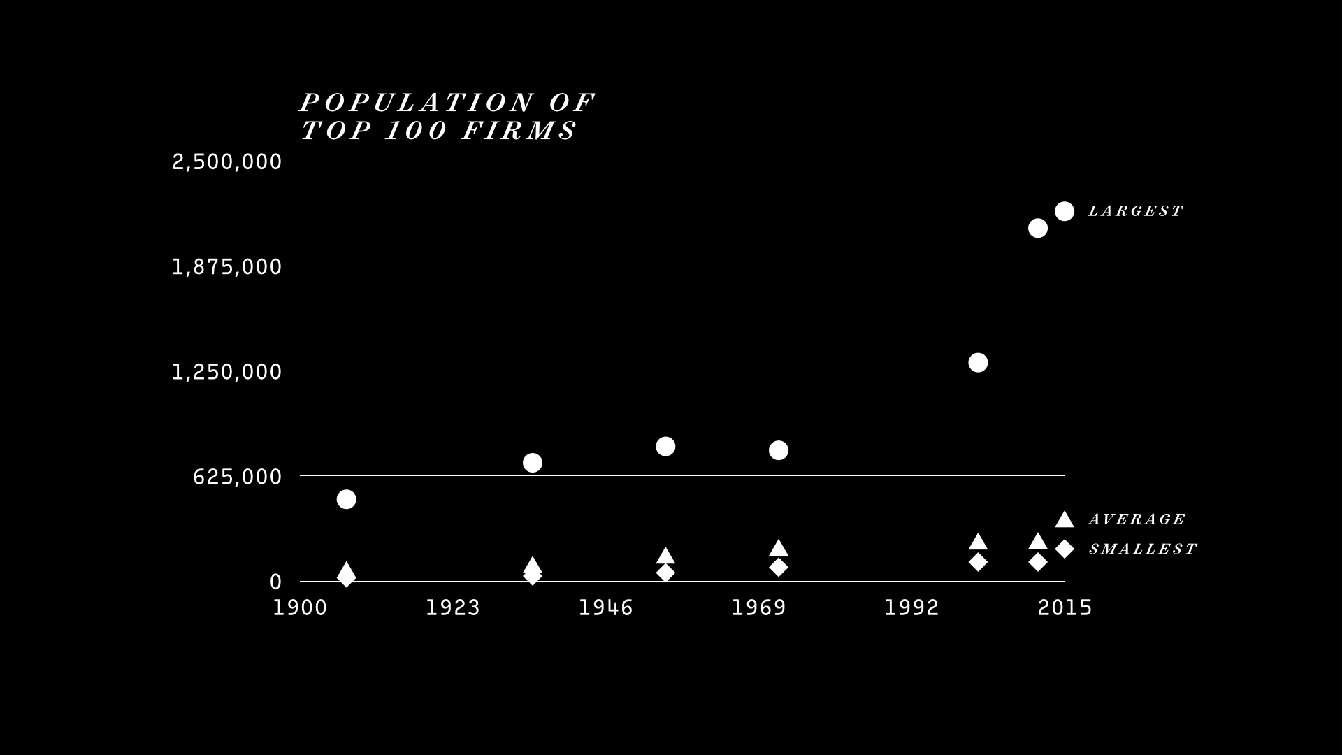 And yet! Firms are growing. The average population of a top 100 firm is now 350,000 people. In the 1970s it was half that.