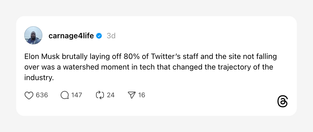 WSJ reporting on the trend toward bragging about reducing headcount and increasing productivity. FWIW I’m not entirely sure this is truly an emerging trend or just something that’s endemic to the companies they profile: Wells Fargo headcount down 23% in five years; Verizon’s headcount in continuous decline and “something we’re very, very good at”; Bank of America set a goal of getting below 200k employees after peaking at 300k in 2010. Intel, Union Pacific, and Loomis are also in there. Not exactly growth or user-experience titans here, but you’ve also got Tobi at Shopify effectively putting the company on a hiring freeze absent proof that you tried to get a computer to do the work first. (Meta’s headcount, referenced above is growing but down from peaks, so not really the same thing.)