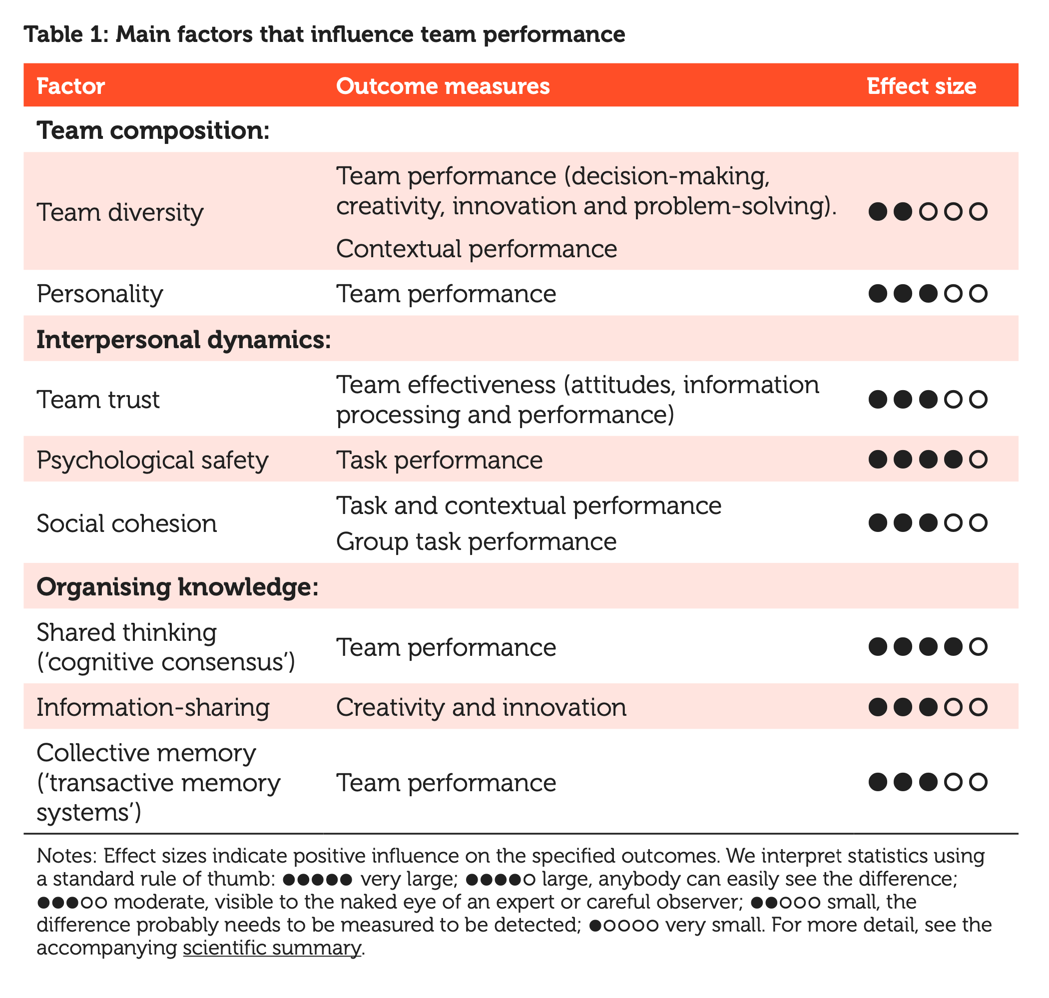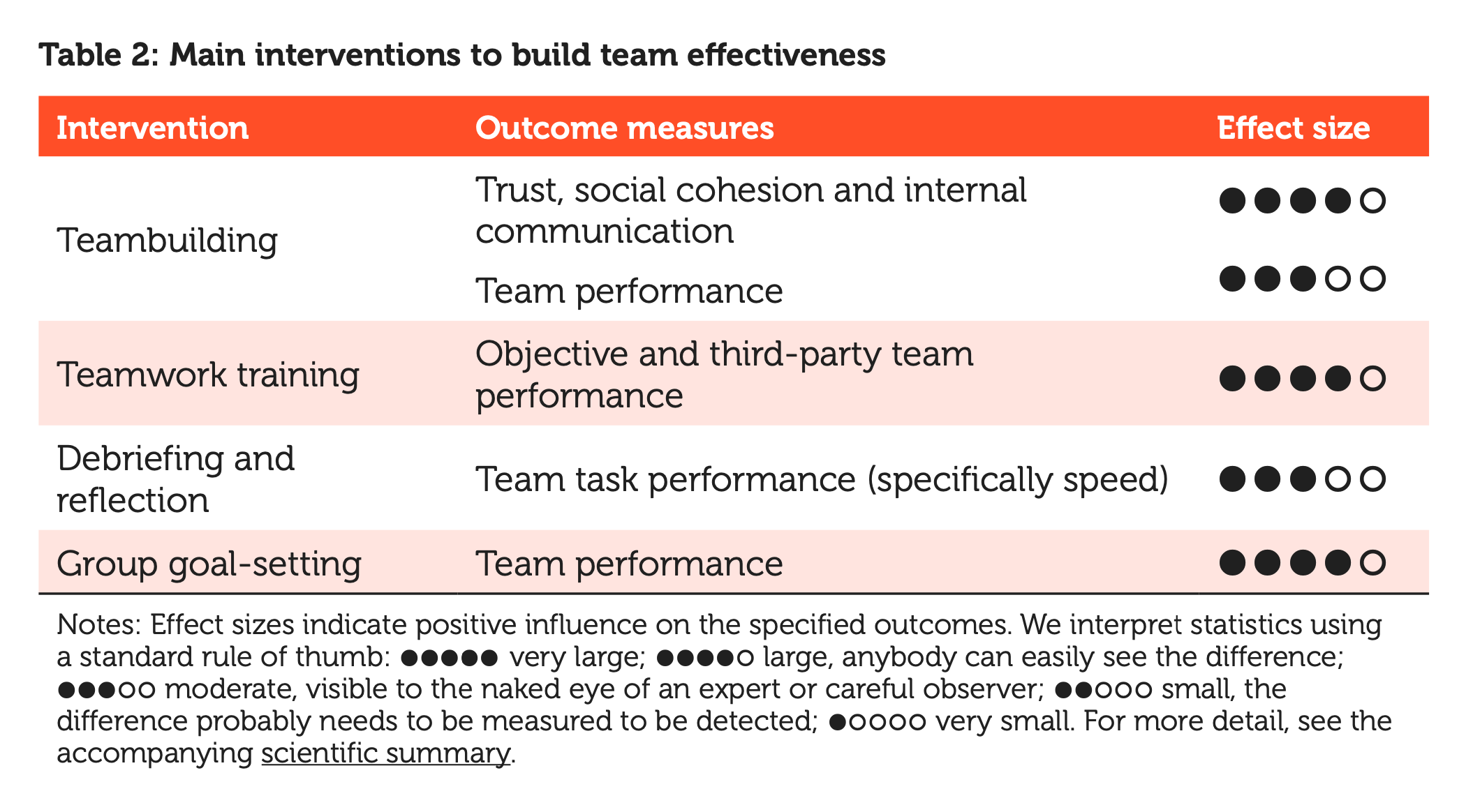 This summary and accompanying evidence review cover a meta-analysis of 70 studies of team performance. The two tables here are the real meat of the study: showing that the strongest effects on team performance are Psychological Safety and Shared Thinking (‘cognitive consensus’…referring to “whether team members define and think about issues in a similar way.” love that!), and that the interventions with the strongest effects on team performance are Teambuilding (vague), Teamwork Training (nice), and Group Goal-Setting.