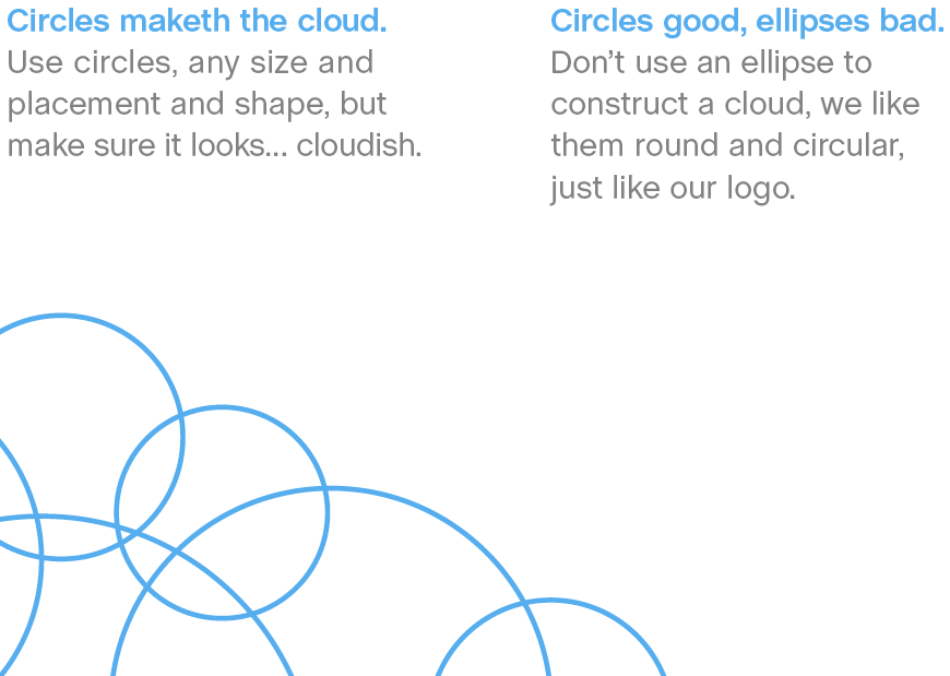 I've just downloaded Skype's Brand Book, which they've recently made public on their site. It's a nice piece of work, and offers a rich, flexible and humorous set of guidelines for the use of Skype's brand elements. They allow for unique cloud designs (see above) and generally shy away from the typical rigidity you typically see in these documents. It appears that they've enjoyed making this document. It's funny, and it's clearly been written by someone with a command, nay, a flair for the English language. When I see something like this, I take a big deep breath of awesome and start to feel good about the future of marketing.