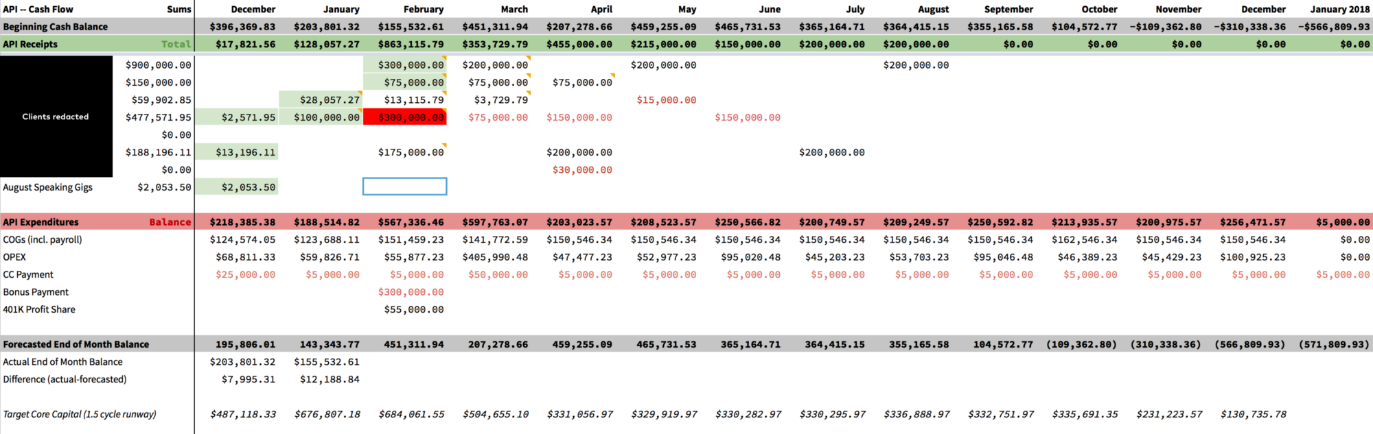 - Things move around — payments are occasionally late, expenditures move up, grow, and shrink, so we’re constantly updating this sheet.