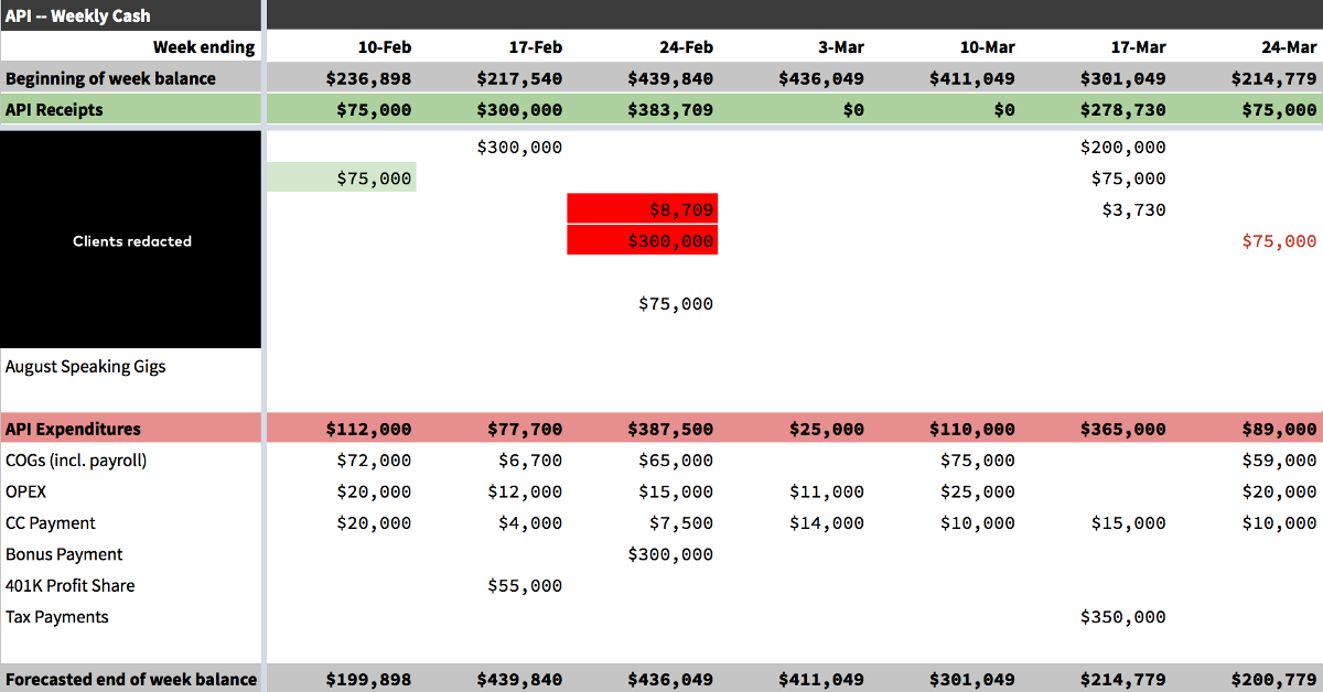 It’s the same basic idea as the previous sheet, but updated more frequently, and with rougher cuts at the numbers. This lets us know if we’re going to be negative in any week, which is pretty important for us, given that we don’t have a line of credit yet.