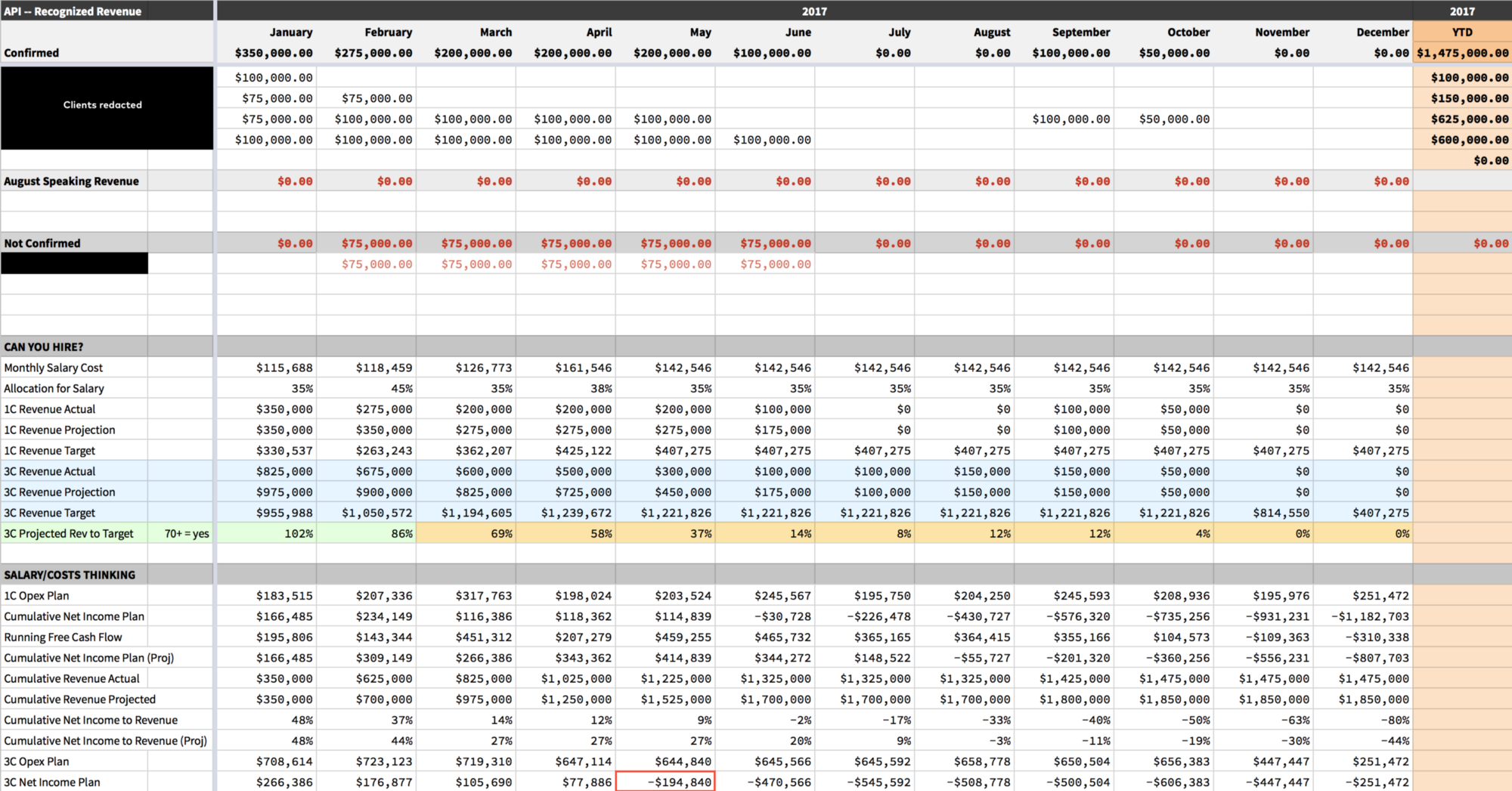These rows are our “advanced analytics” for the business and give us different views into how well we’re performing. For example: on one hand, we’ve got enough cash and A/R to last us into October. On the other hand, if we don’t sell any more work on top of the $1.4m we’ve already sold, we become unprofitable by June. None of these numbers are used to run the business — just different “opinions” as to how we’re doing.