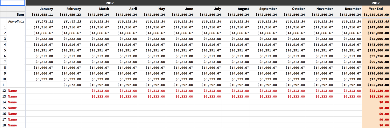 This is where we track how much we pay each other. Nothing really special here, save for the fact that this is public within the organization. The completed red lines represent planned hires, and the sums are included in our cashflow planning. As a result, our runway always includes planned growth.