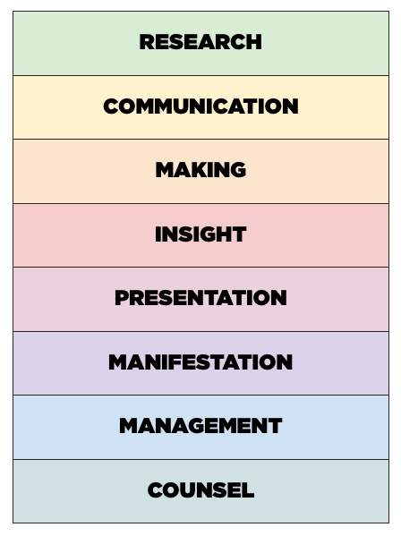 Each of the skills has frame that holds a lifetime of work, where it would be possible for a person to focus on just one skill and build a successful career, if not as a consultant. In this way, the system that can work as a personal equalizer: it’s not important or possible to be good everywhere, and as a strategist, it’s not particularly effective to be too focused. To Mike Arauz’s point, we’re not actually looking for T-shaped people. We’re looking for square-shaped people.