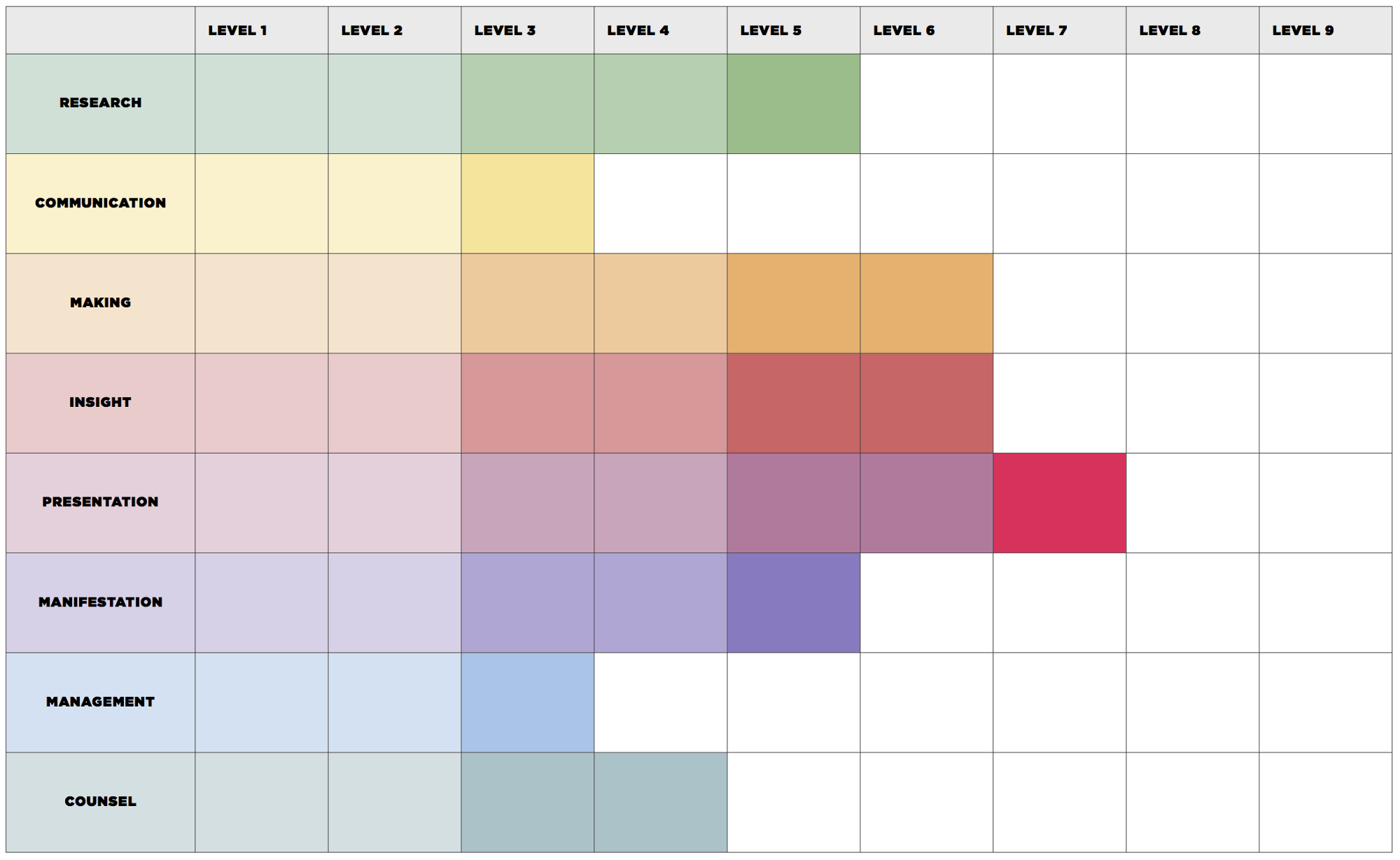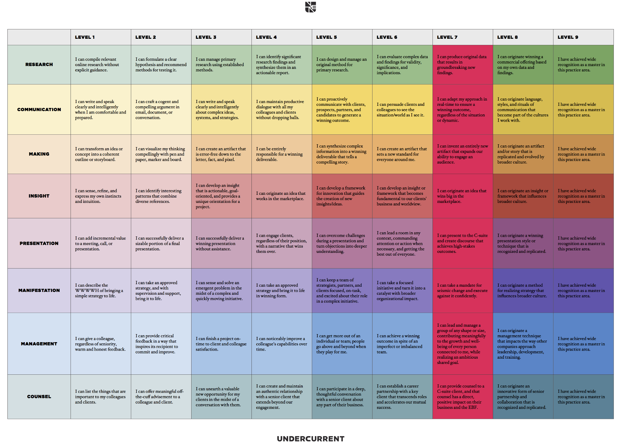 We created nine levels of maturity (nine different color belts in Karate, right?) and pegged level nine to total mastery of the subject, and level one to the most basic expectation for incoming team members. Level seven was set as “the best we can realistically hope for” at Undercurrent and provides a guide for what we hope everyone can achieve here after several decades of consulting senior-level clientele.