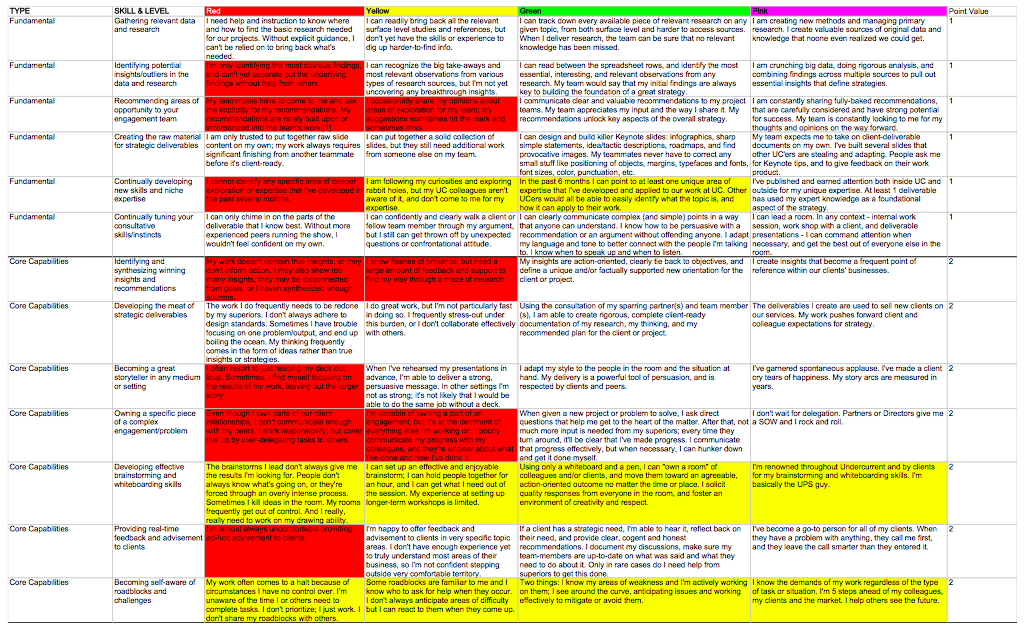 Around two years ago (in 2011), we realized that we needed to provide clarity around progression at UC and in the broader context of individual careers. For a variety of factors — one being that we hire entrepreneurial, inquisitive, ambitious types — we were getting a lot of questions about what comes next at UC. What’s required to make Senior Strategist? When should I expect a raise? What do I need to do to get better? How do the skills I’m building here contribute to my story as an individual?