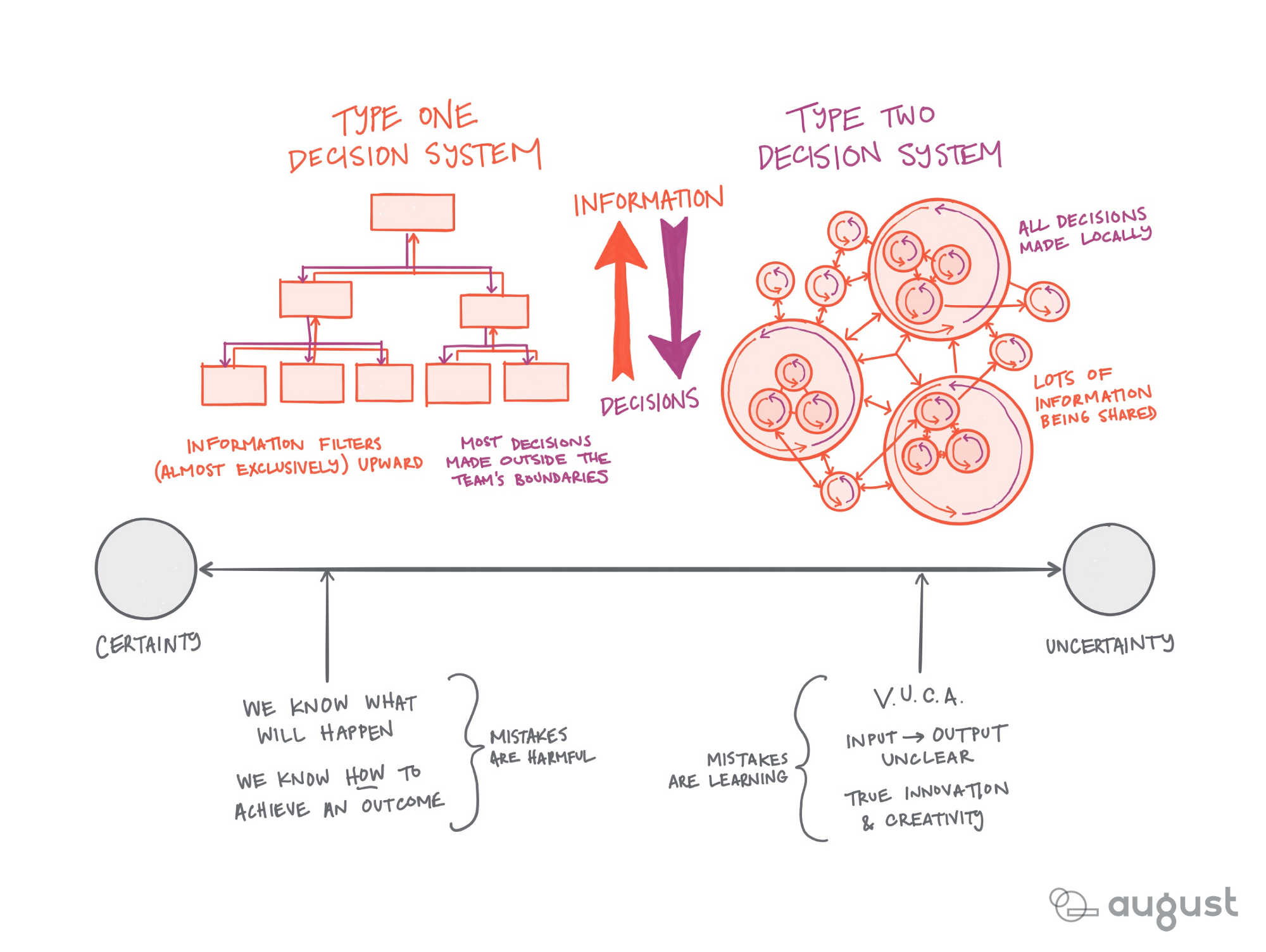 Anyway. This all makes a ton of sense if you think the future is going to bring predictability and calm. If the world is getting more uncertain, more volatile, more unpredictable, though, it’s not advantageous to optimize around Type 1 decision-making. Thankfully (of course, right?), the software era allows for a different type of organization.