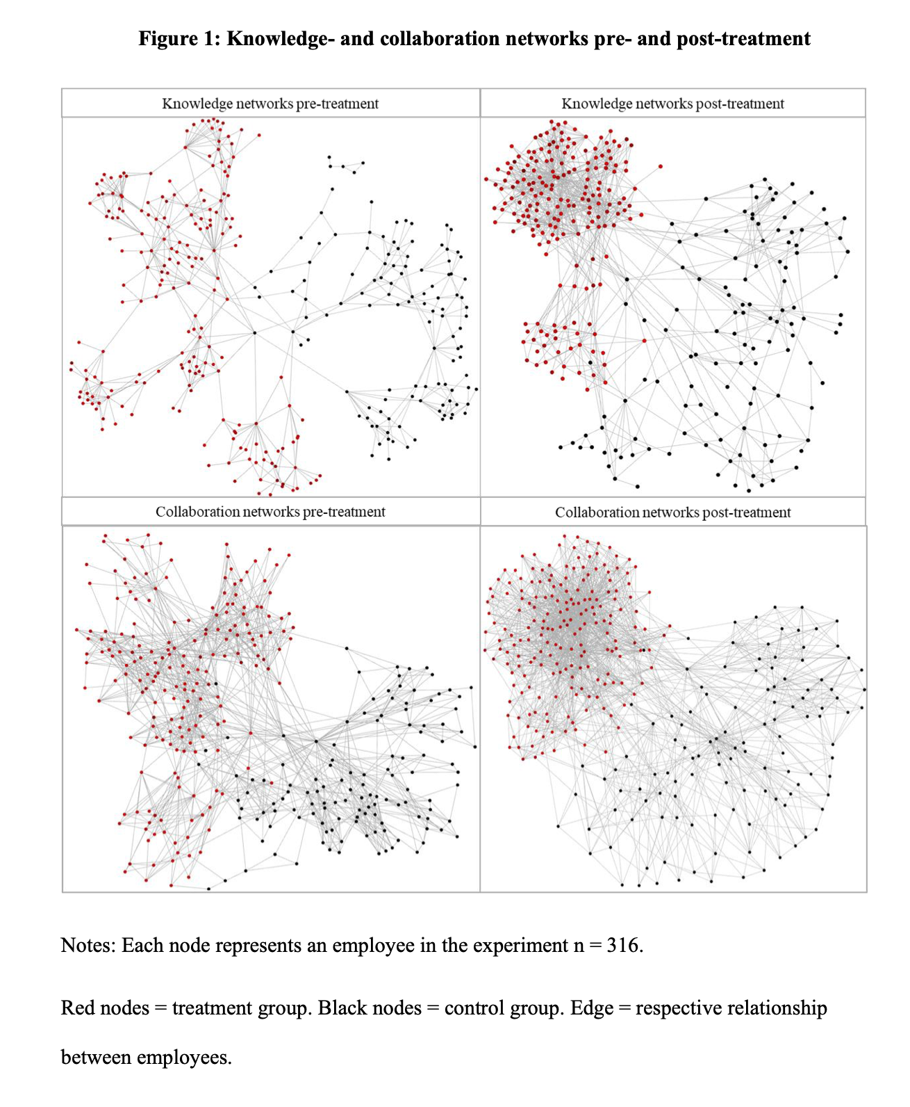 - The network itself changed shape. The before/after network visualizations are striking: treatment group nodes (red) go from scattered clusters to a dense, interconnected mesh. The org's informal structure literally rewired in three months.
