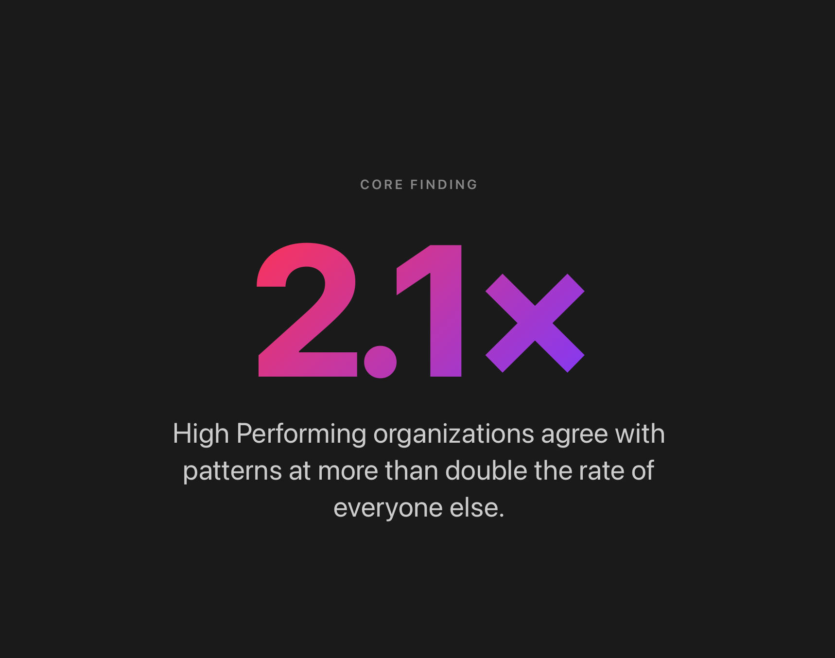 High Performing organizations agree with the pattern indicators at 2.1x the rate of everyone else. Agreement rate (4+ on a 5-point scale): High Performing = 65.7%, Everyone Else = 32.0%. With n = 17, this is suuuuper early and directional, not conclusive. But it's a wide gap for a first look.