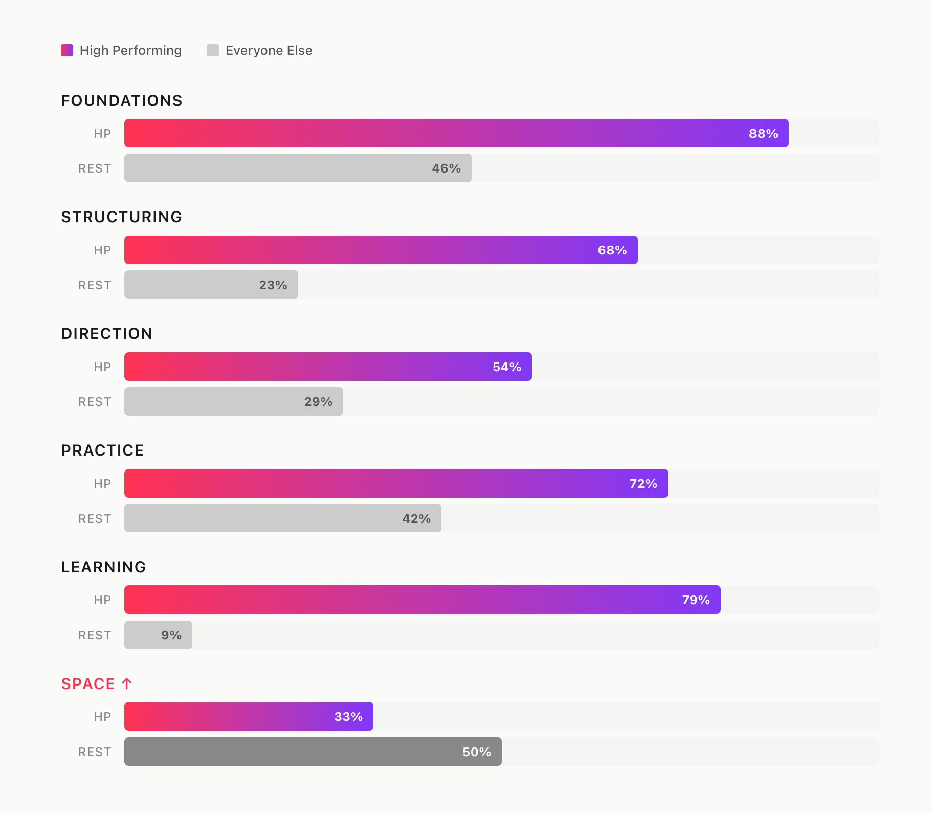 Learning is the biggest differentiator. Patterns like Experimentation, Flow State Work, and Length Limit show a 70-percentage-point gap in agreement (79% High Performing vs. 9% Everyone Else).